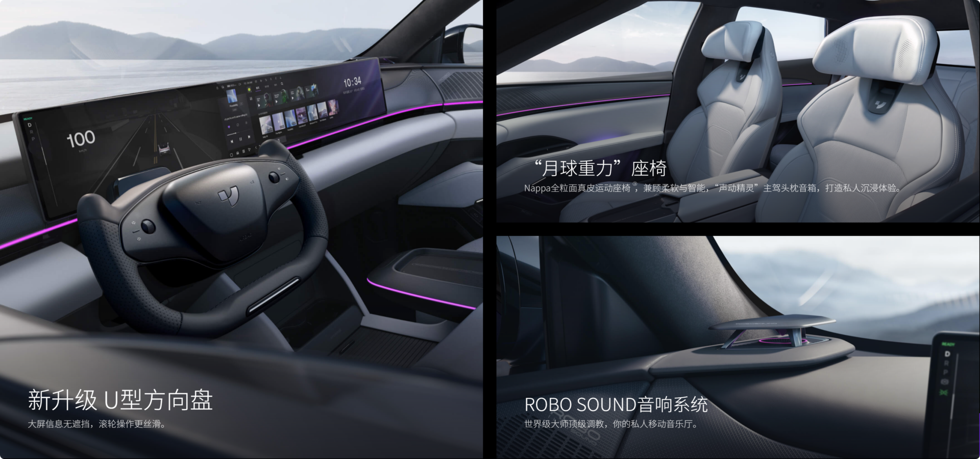最戳我的是那块35.6英寸的一体式大屏,几乎占了仪表台大半,6K分辨率亮起来的瞬间,科技感直接拉满。更绝的是它的语音助手SIMO,500ms的识别速度,比我反应都快,弱网断网也能流畅响应,主驾免唤醒、连续指令都不在话下,试过这么多车,没一台能在语音交互上赢过它。还有那半幅U型方向盘,酷得不像话,不遮挡视线,开在路上总被人多看两眼。